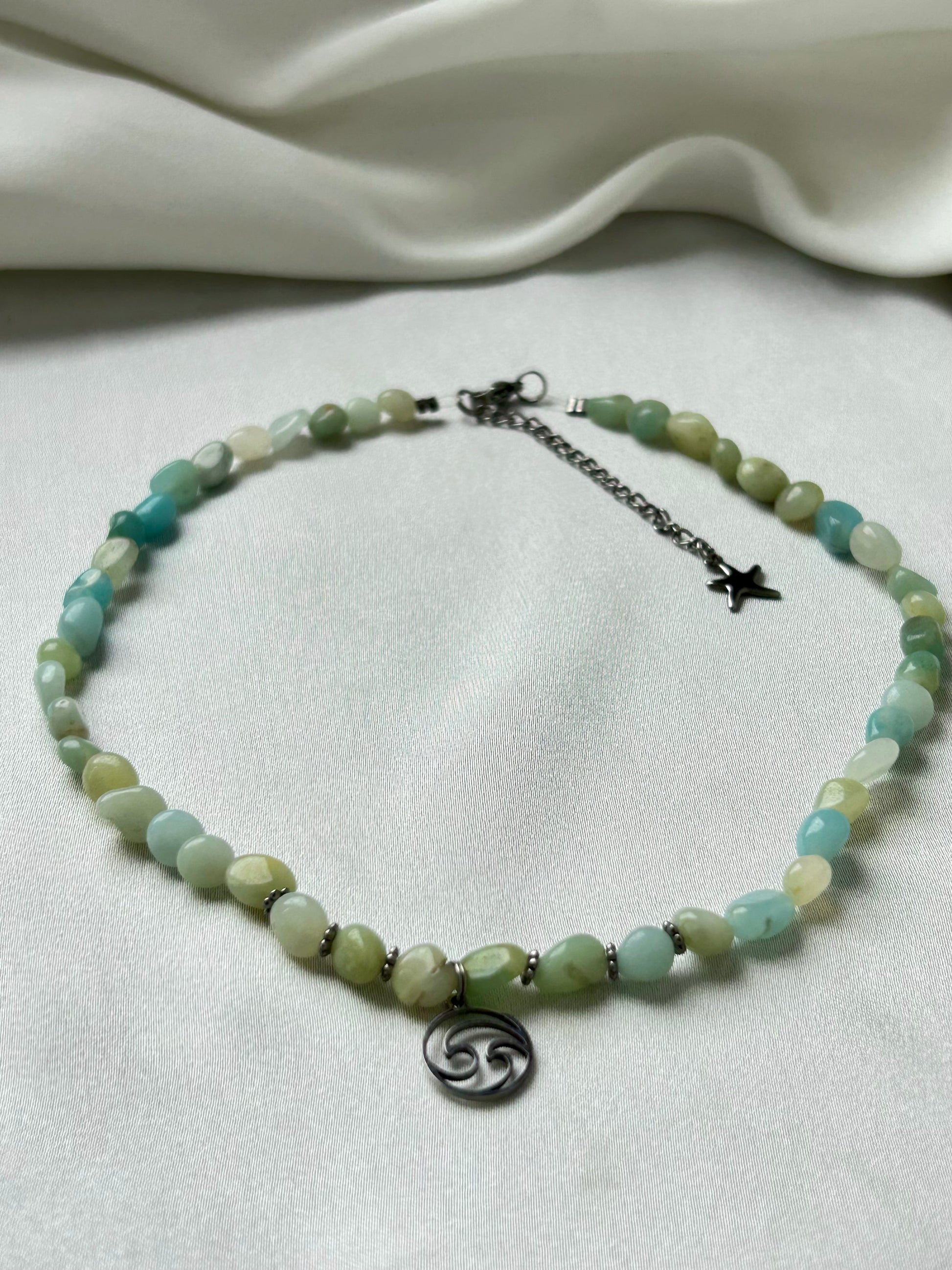 Choker made of stainless steel pendant, natural amazonite beads and stainless steel findings.