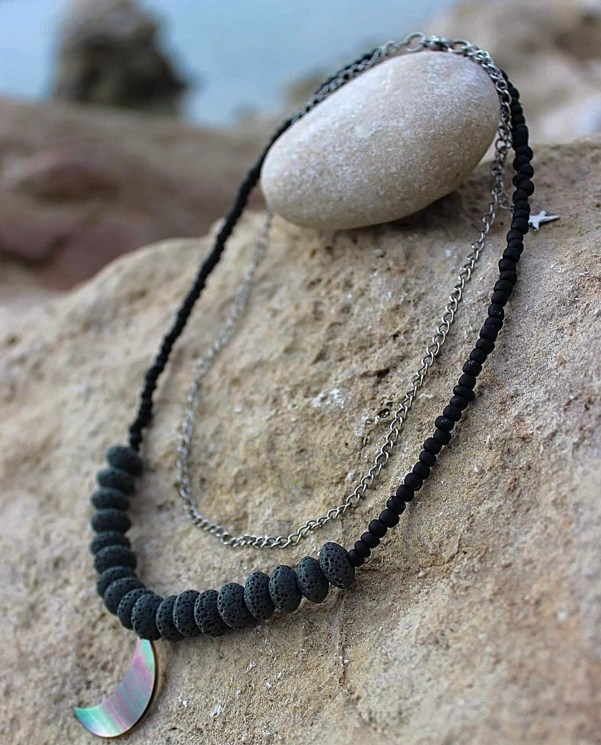 Choker made of black lip shell pendant, natural lava and glass beads with stainless steel findings.