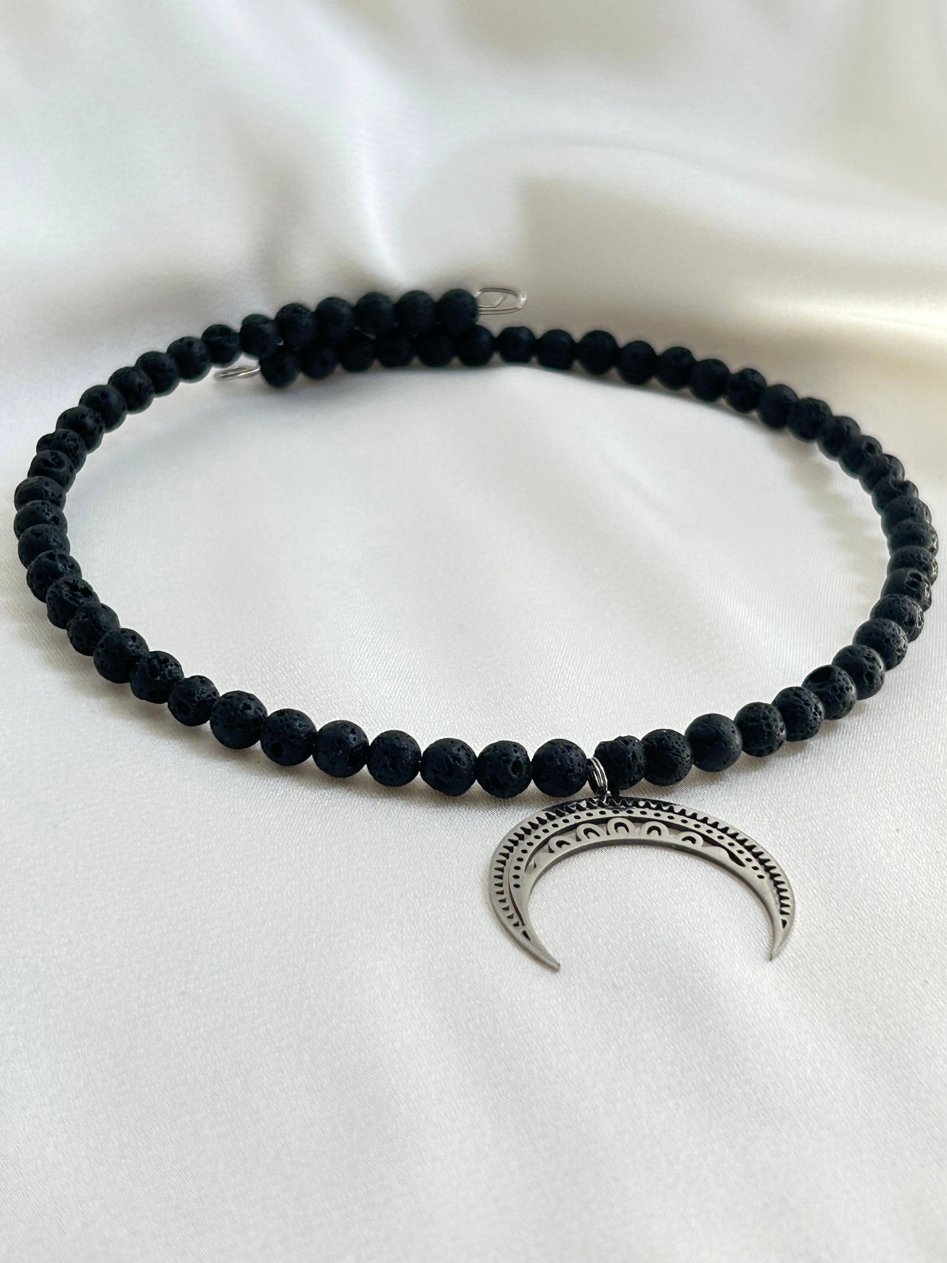 Silver Moon Choker is made on memory wire, with natural lava beads and stainless steel pendant.